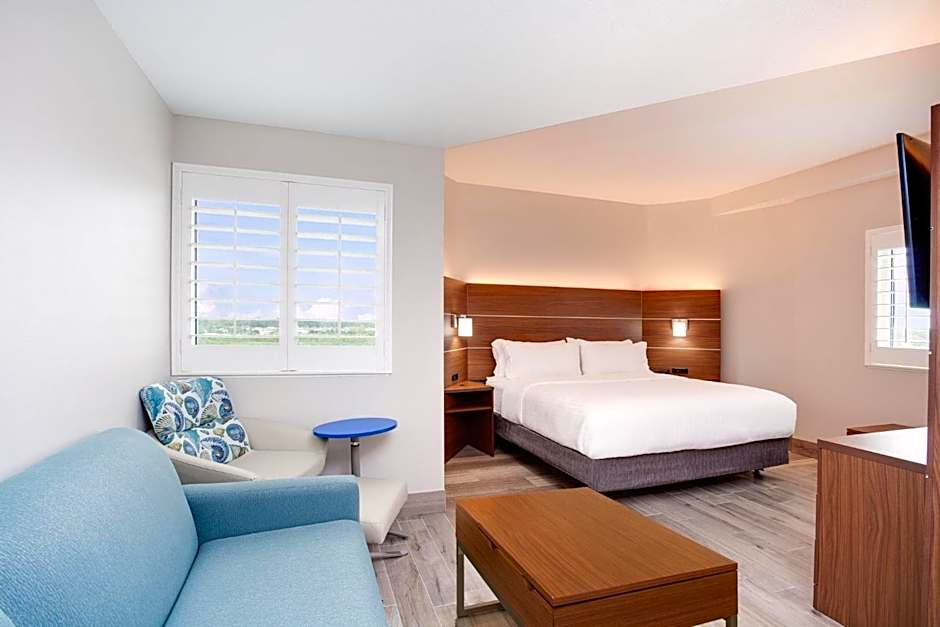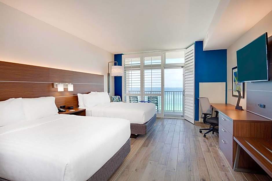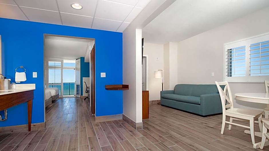 This room features a 43 inch high-definition flat-screen TV and USB charging stations. A full size refrigerator and microwave are also available. A private balcony is available for guests to enjoy. A work area with an ergonomic chair is also included.